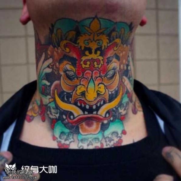 脖子上个性十足的彩色骷髅纹身_脖子纹身图案大全_纹身图吧