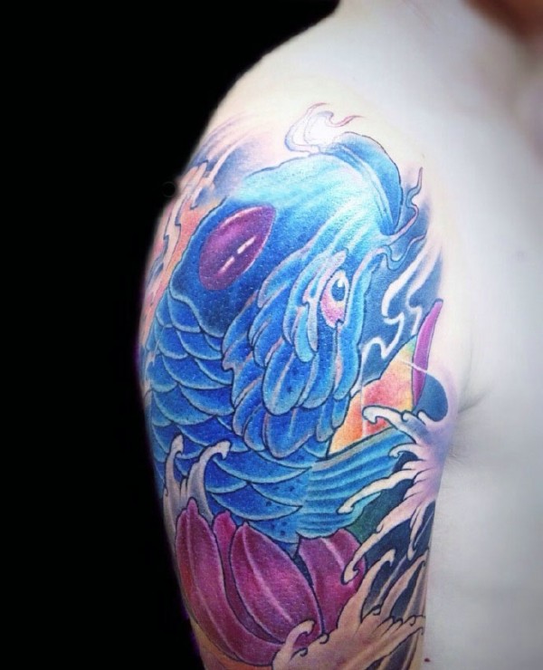大臂精神抖爽的蓝鲤鱼纹身图案