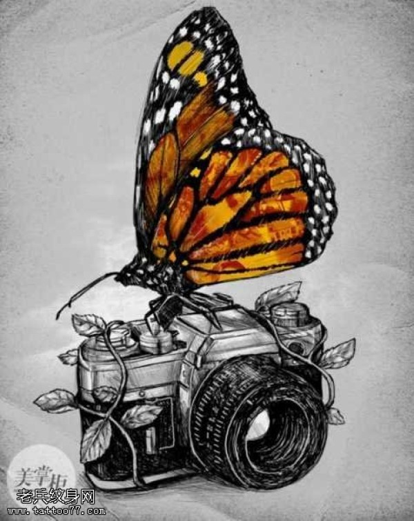 手稿相机蝴蝶纹身图案