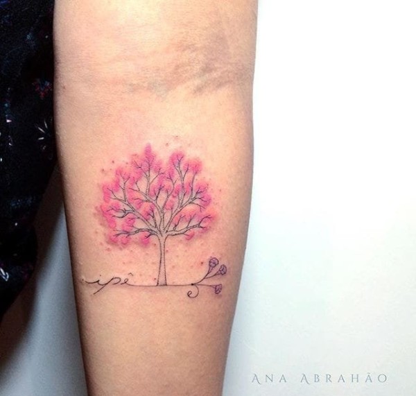 女生手臂上的浅彩色微型树纹身图案