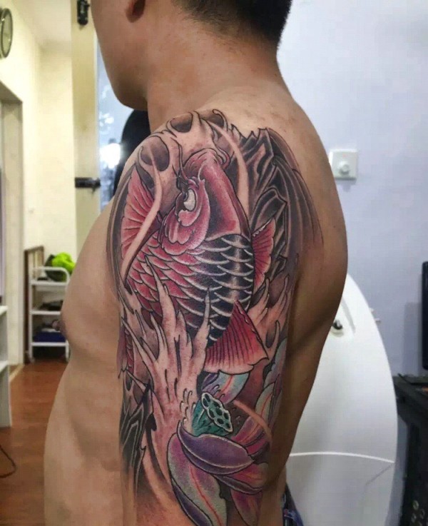 大臂传统有型的红鲤鱼纹身图案