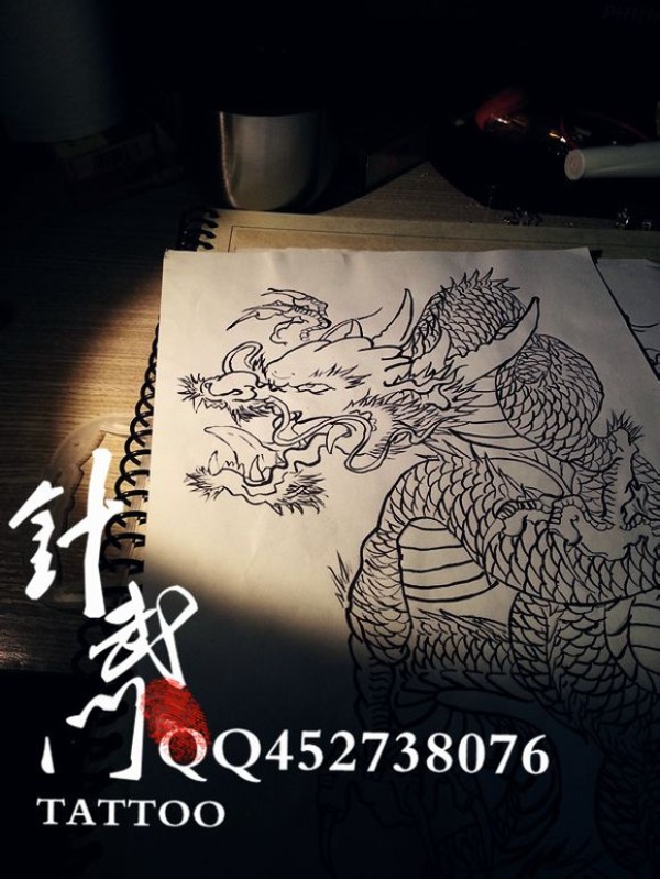 龙纹身手稿_一组老传统黑灰龙手稿纹身图案
