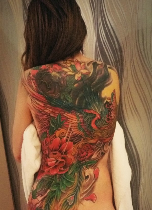 亮瞎双眼的满背七彩凤凰纹身图案