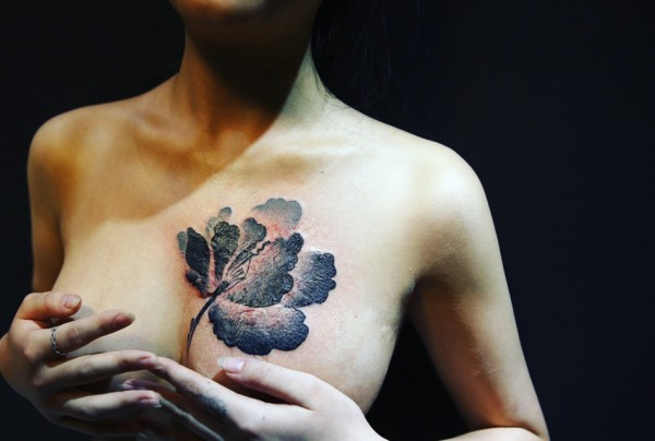 裸妹纸胸前水墨花朵纹身非常妩媚