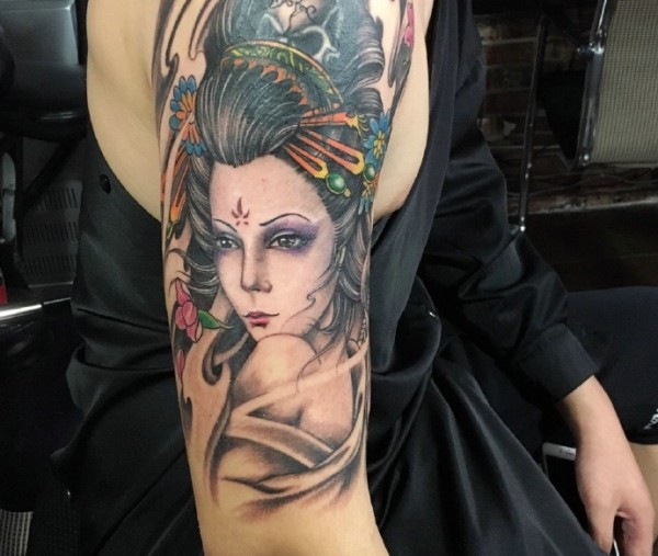 手臂一枚彩色古代花妓纹身图案