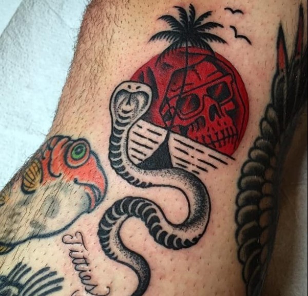 红色落日骷髅头纹身图案来自弗兰基