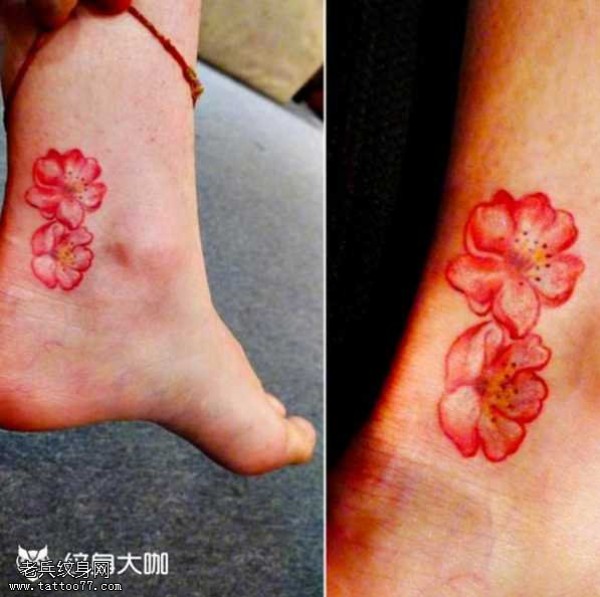 脚部粉花纹身图案