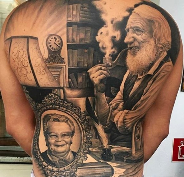 背上的女生肖像纹身图案和纹身手稿