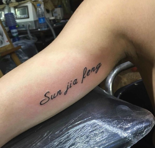 中国有嘻哈TT手臂上花体英文纹身图片