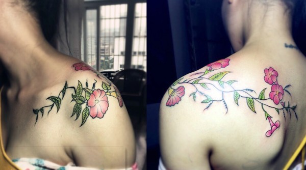 女生肩花纹身_15张女性双肩对称的肩花纹身图案作品图片