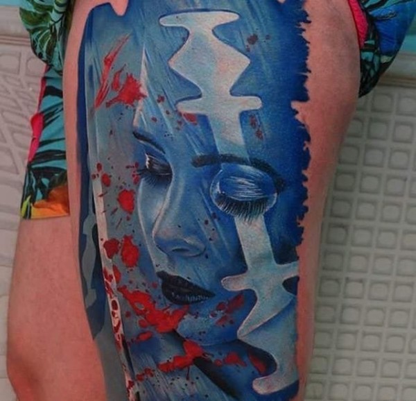 大腿上刀片女性肖像图案纹身图片