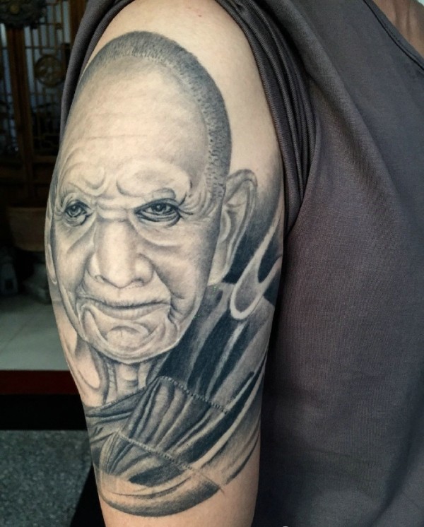 大臂一枚老奶奶肖像纹身图案很精致