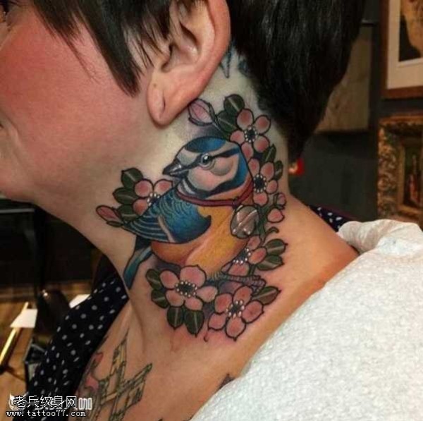 男人脖子彩色燕子刺青图案图片_脖子纹身图案大全_纹身图吧