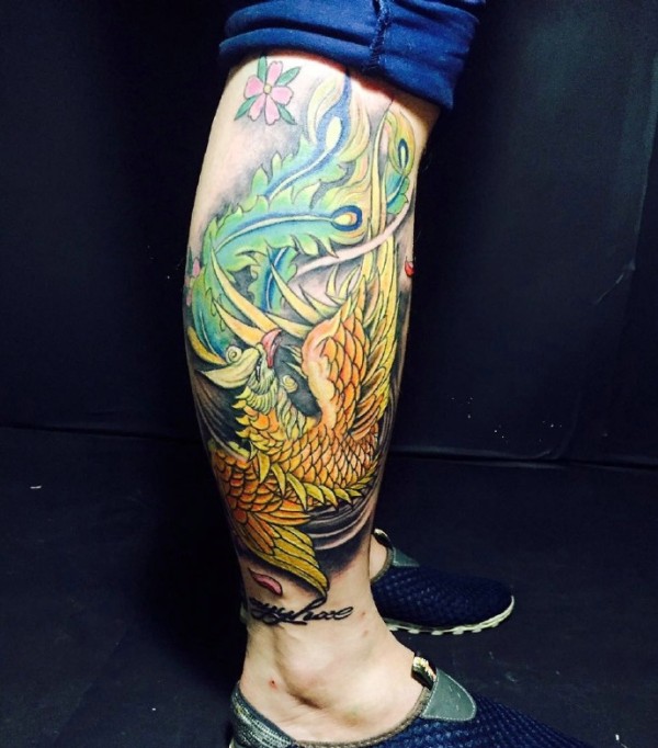 包小腿美丽动人的彩色凤凰纹身图案
