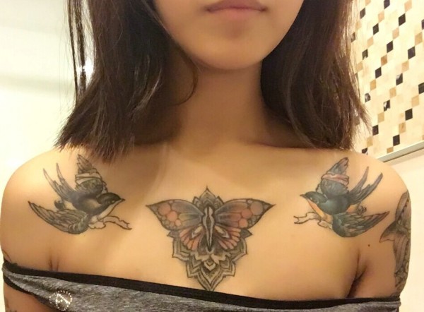 男人脖子彩色燕子刺青图案图片_脖子纹身图案大全_纹身图吧