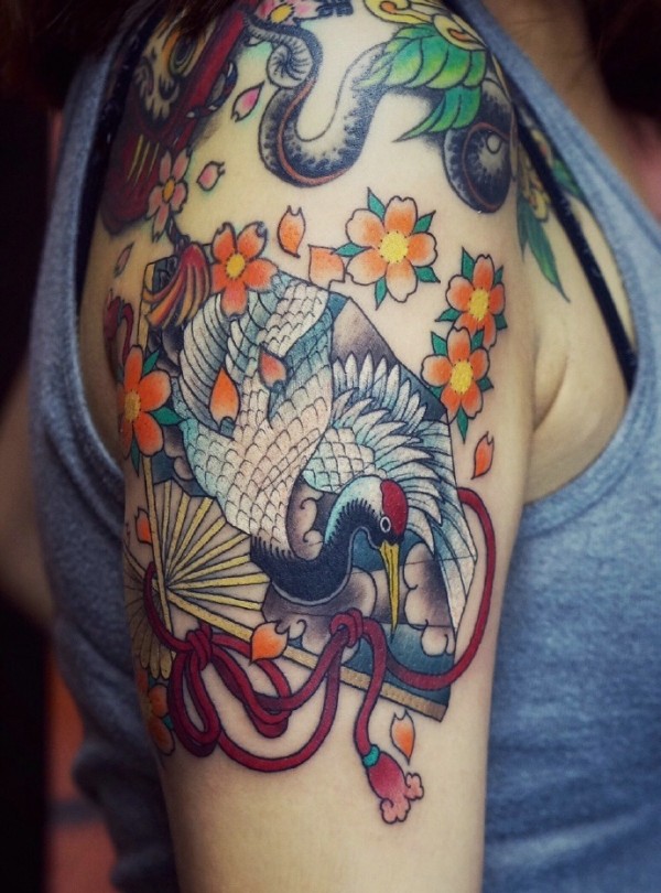 五颜六色的大臂各种图案一起的纹身
