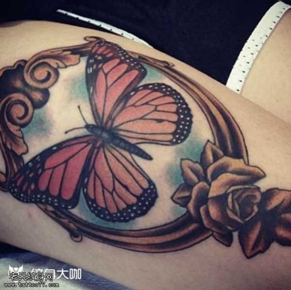 腿部镜子蝴蝶纹身图案