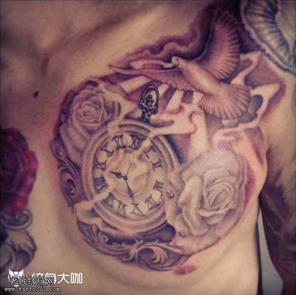 胸部闹钟玫瑰纹身图案