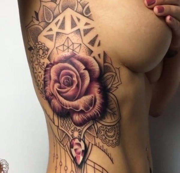 花臂纹身女生侧肋上传统风格曼陀罗花图案纹身