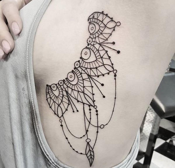 花臂纹身女生侧肋上传统风格曼陀罗花图案纹身