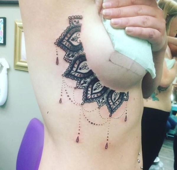 花臂纹身女生侧肋上传统风格曼陀罗花图案纹身