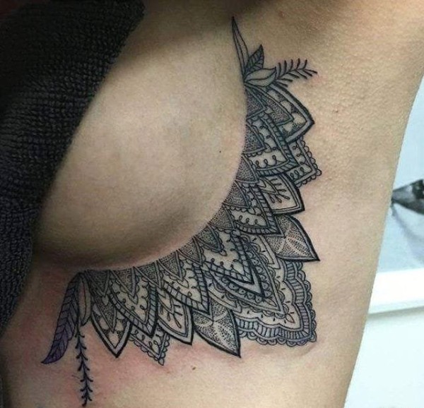花臂纹身女生侧肋上传统风格曼陀罗花图案纹身