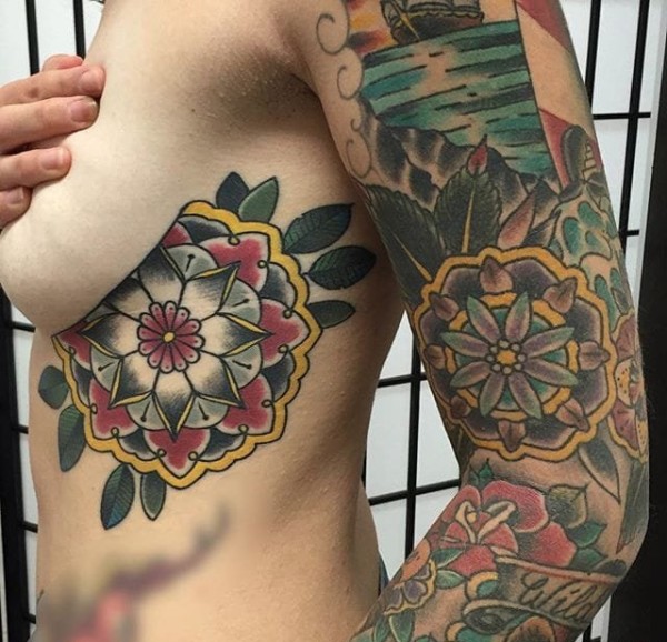 花臂纹身女生侧肋上传统风格曼陀罗花图案纹身