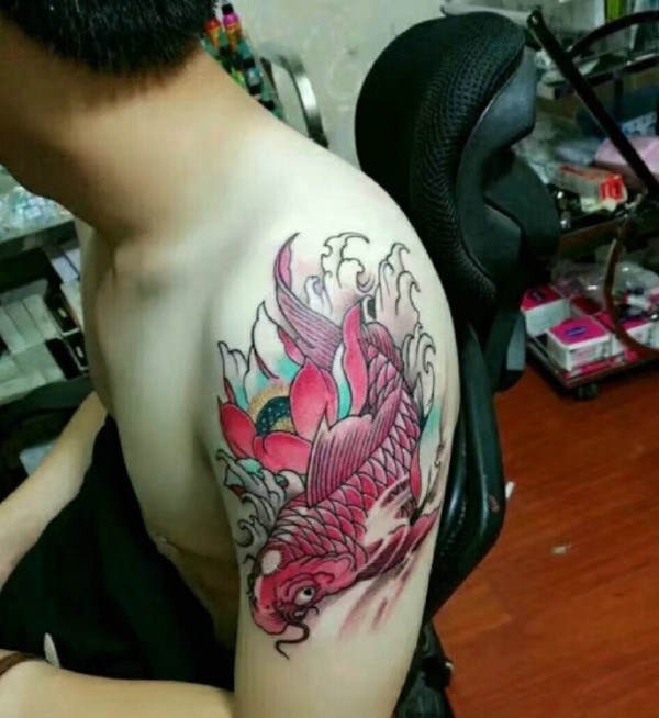 大臂一只活泼乱跳的红鲤鱼纹身图案
