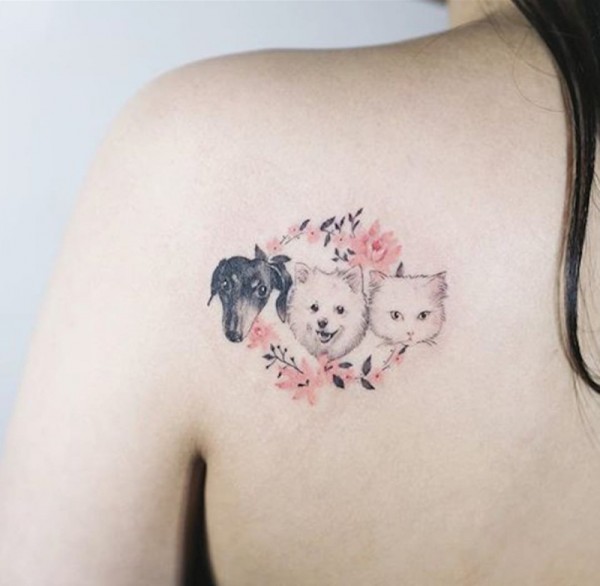 女生大腿上的三只小清新宠物猫咪纹身图案