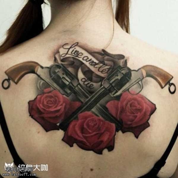 背部玫瑰手枪纹身图案