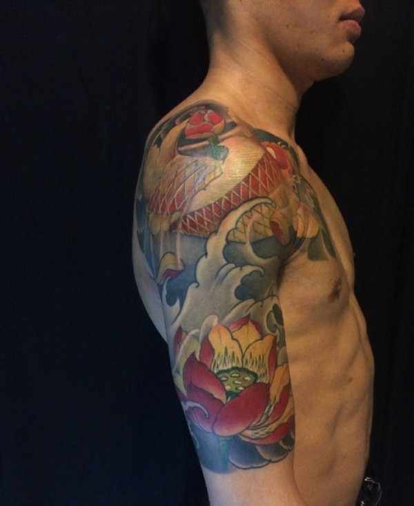 色彩鲜艳的半甲金鲤鱼纹身图案