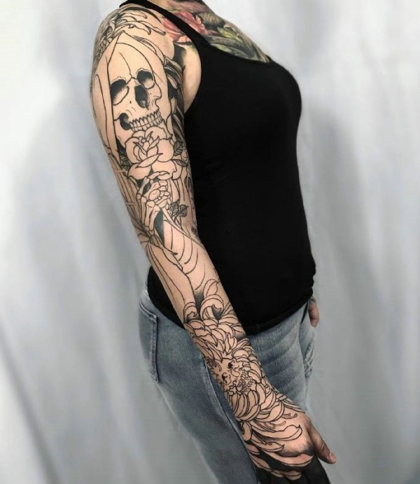 花臂有神的个性骷髅纹身图案