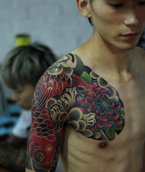 帅气小鲜肉半甲日式鲤鱼纹身图案