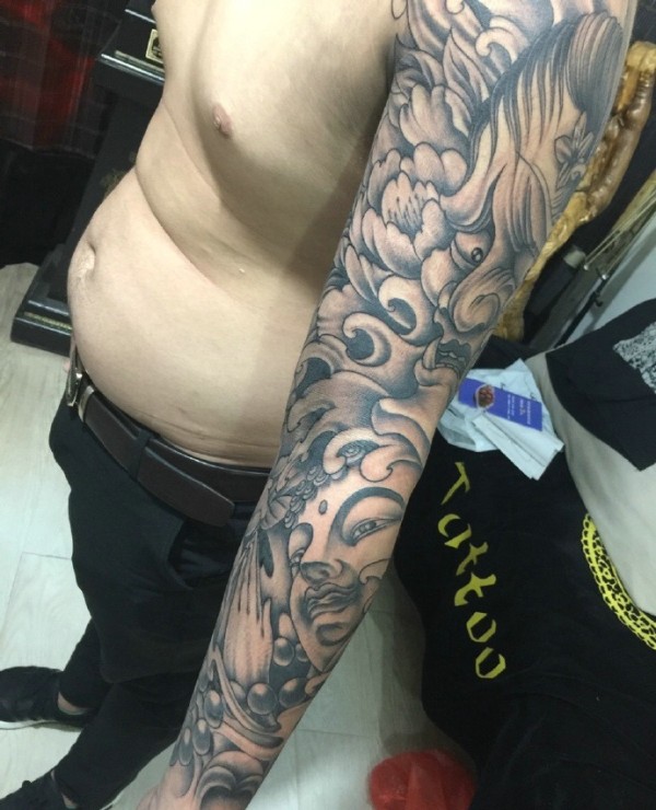 花臂波浪形的经典般若纹身图案