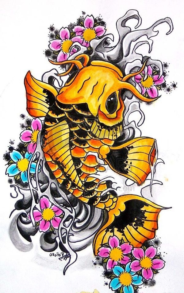 漂亮的彩色鲤鱼纹身图案手稿