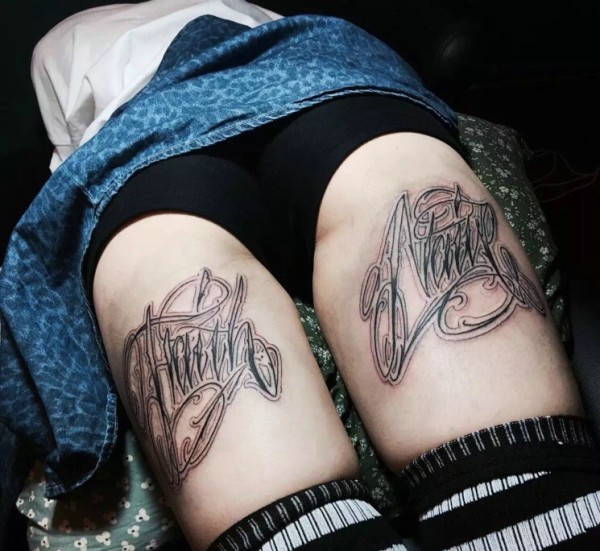 双腿部嚣张的花体英文纹身图案