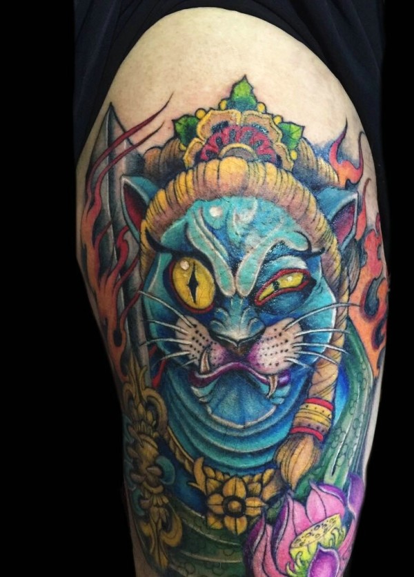 色彩多多的日式花猫手臂纹身图案