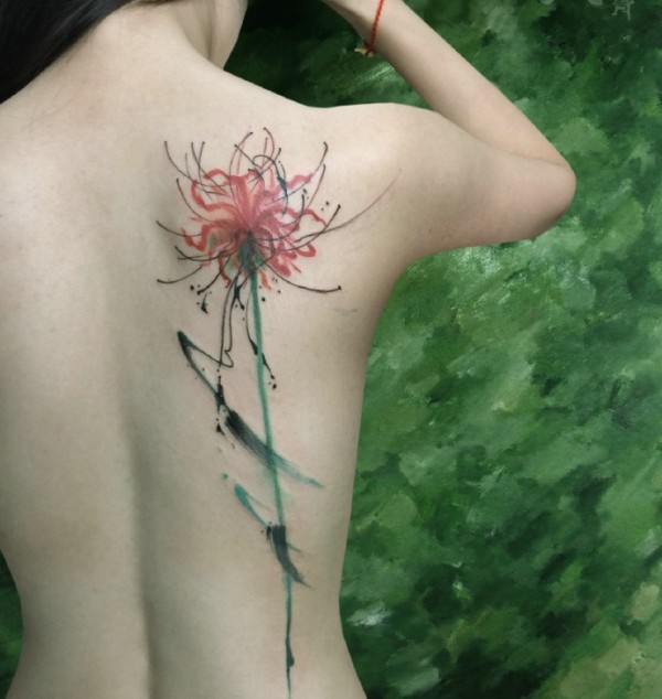 长发女生后背漂亮的彼岸花纹身图案