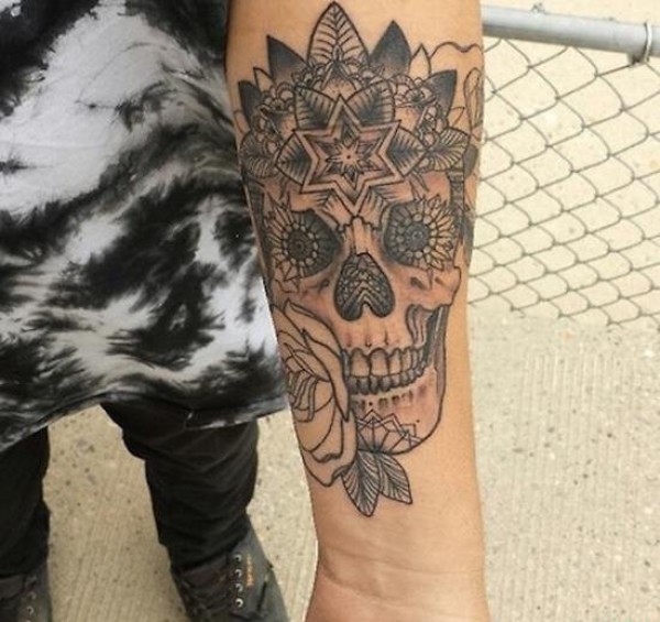 女生手臂经典潮流的骷髅与玫瑰花纹身图案