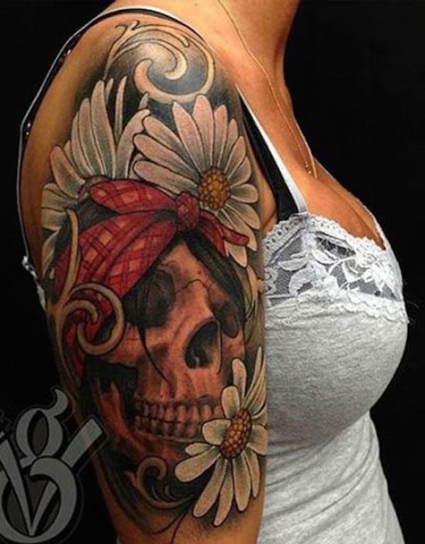 女生手臂经典潮流的骷髅与玫瑰花纹身图案