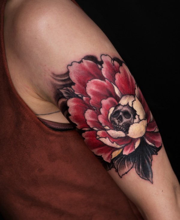 女生手臂经典潮流的骷髅与玫瑰花纹身图案