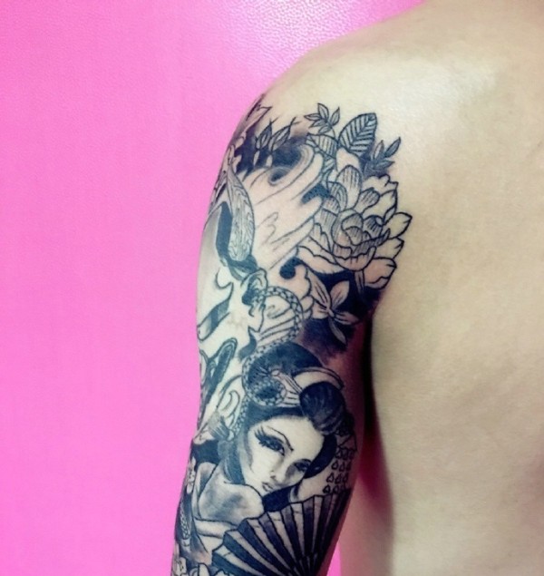 花妓与般若结合的花臂纹身图案