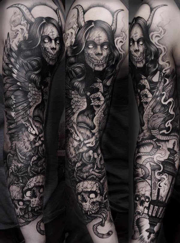 花臂抽象几何图形骷髅头眼睛纹身图案