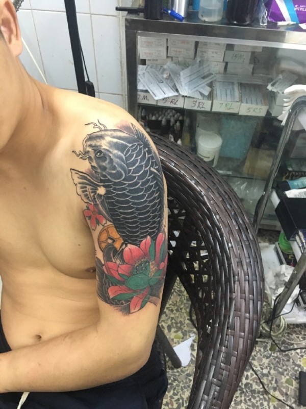 彩色莲花与黑白鲤鱼的手臂纹身图案