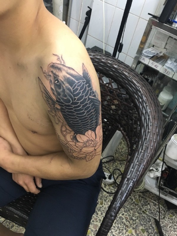 彩色莲花与黑白鲤鱼的手臂纹身图案