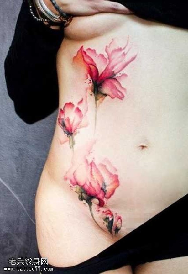 女生玲珑腰部的依兰花图案纹身女生腰部嫣红底_腰部纹身图案大全_纹身图吧
