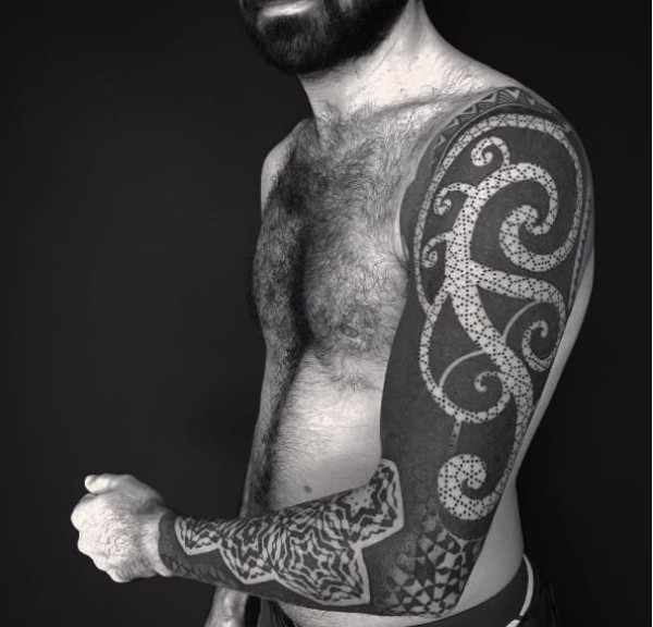 花臂膀男性右侧半身黑色几何图形纹身图案