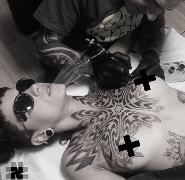 花臂膀男性右侧半身黑色几何图形纹身图案