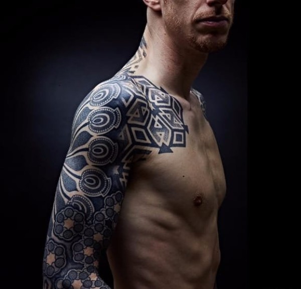 花臂膀男性右侧半身黑色几何图形纹身图案