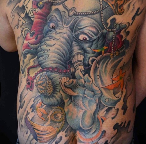 满背彩色传统大象神纹身图案
